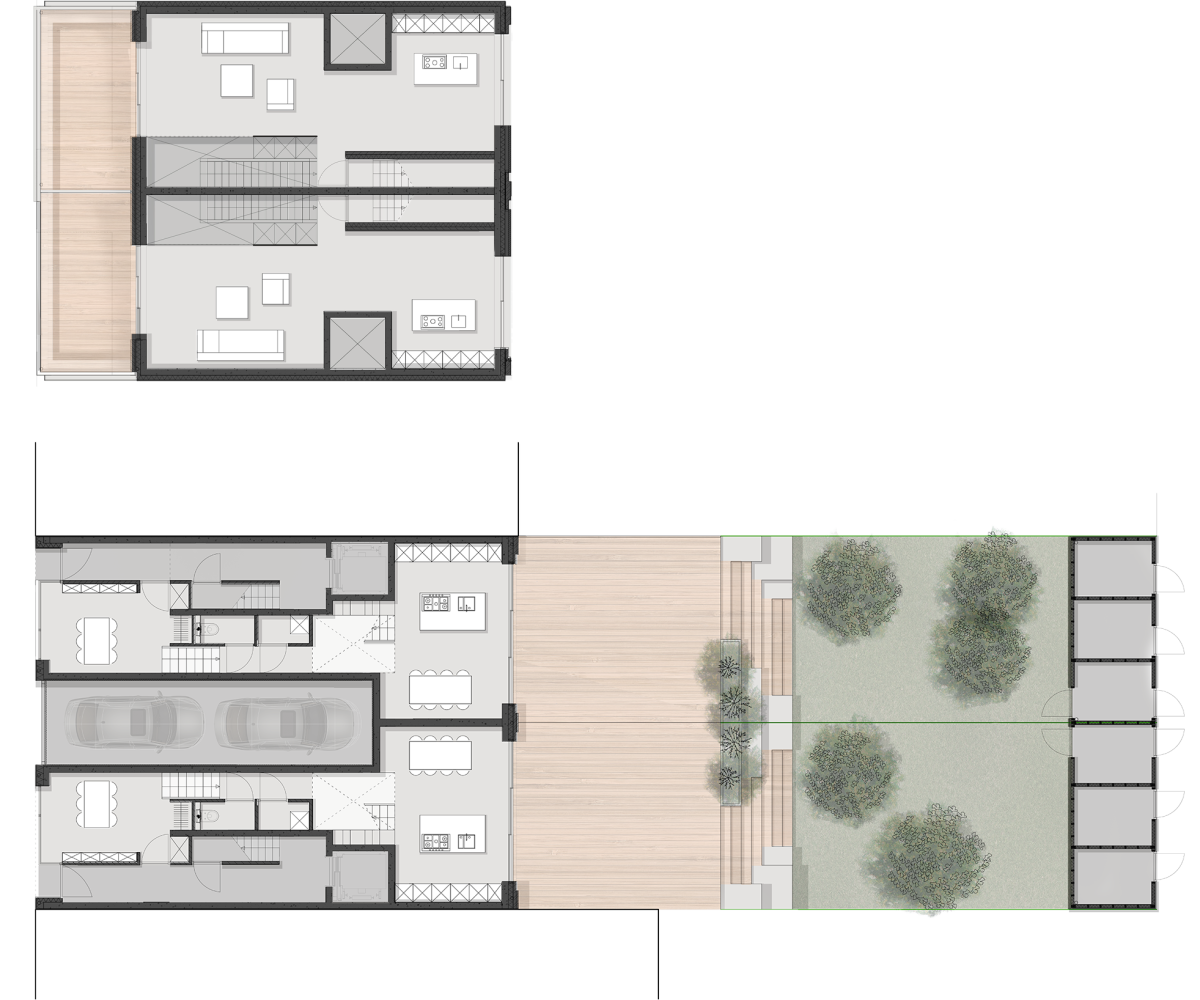 Each of the six dwellings follows a split-level typology, establishing fluid spatial connections and rich visual relationships between different living areas. This vertical layering creates a dynamic sense of movement within the home — where subtle shifts in height define zones without the need for solid partitions. The front spaces are oriented towards the street, encouraging interaction with the public realm and connecting daily life to the rhythm of the neighborhood, while the rear of each dwelling gradually rises to a more secluded garden level that offers privacy and calm.