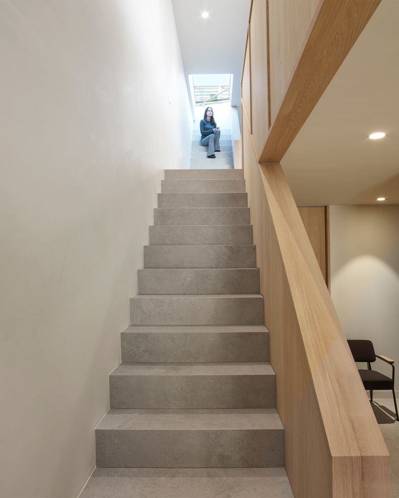 At the heart of each dwelling lies a split-level configuration that defines the rhythm and character of the interior. Subtle shifts in height create natural transitions between the various living zones — from entrance to living room to more private areas. A vertical core of light connects all floors, bringing daylight deep into the interior and emphasizing spatial continuity.