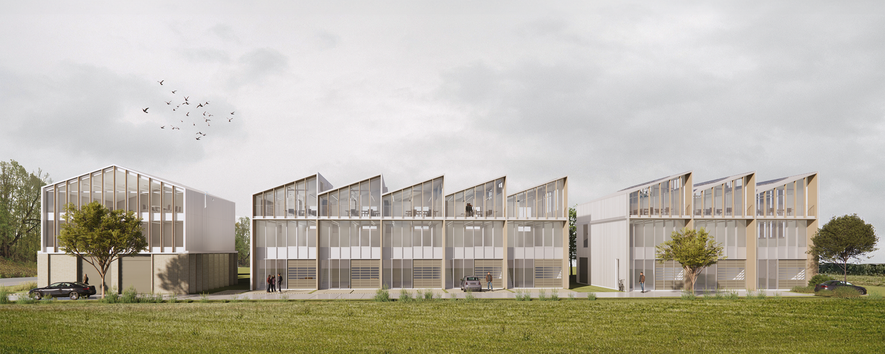 The buildings were designed using a modular construction system with a cohesive material palette of brick, metal, and glass. Shed roofs ensured even northern daylight, emphasizing the functional character of the workspaces. The front volume featured a richer material expression, while the rear volumes were simpler but consistent in style. A restrained color scheme of greys and sand tones harmonized the complex with its surroundings, and sustainable measures — including permeable paving and native plantings — supported water retention and biodiversity, embedding the development within the natural polder landscape.