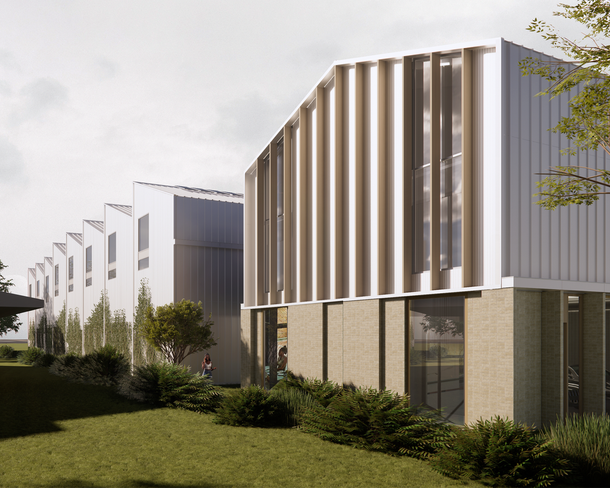 The project referenced the traditional lintbebouwing typology — a linear development along the road. The complex was organized into three interconnected volumes: a front “house” facing the street and two barn-like volumes set back behind it. This layout preserved the rhythm of the existing streetscape and created visual corridors toward the polder. The spaces between the buildings were filled with semi-open surfaces featuring grass pavers, enhancing the integration of the development with the surrounding landscape.