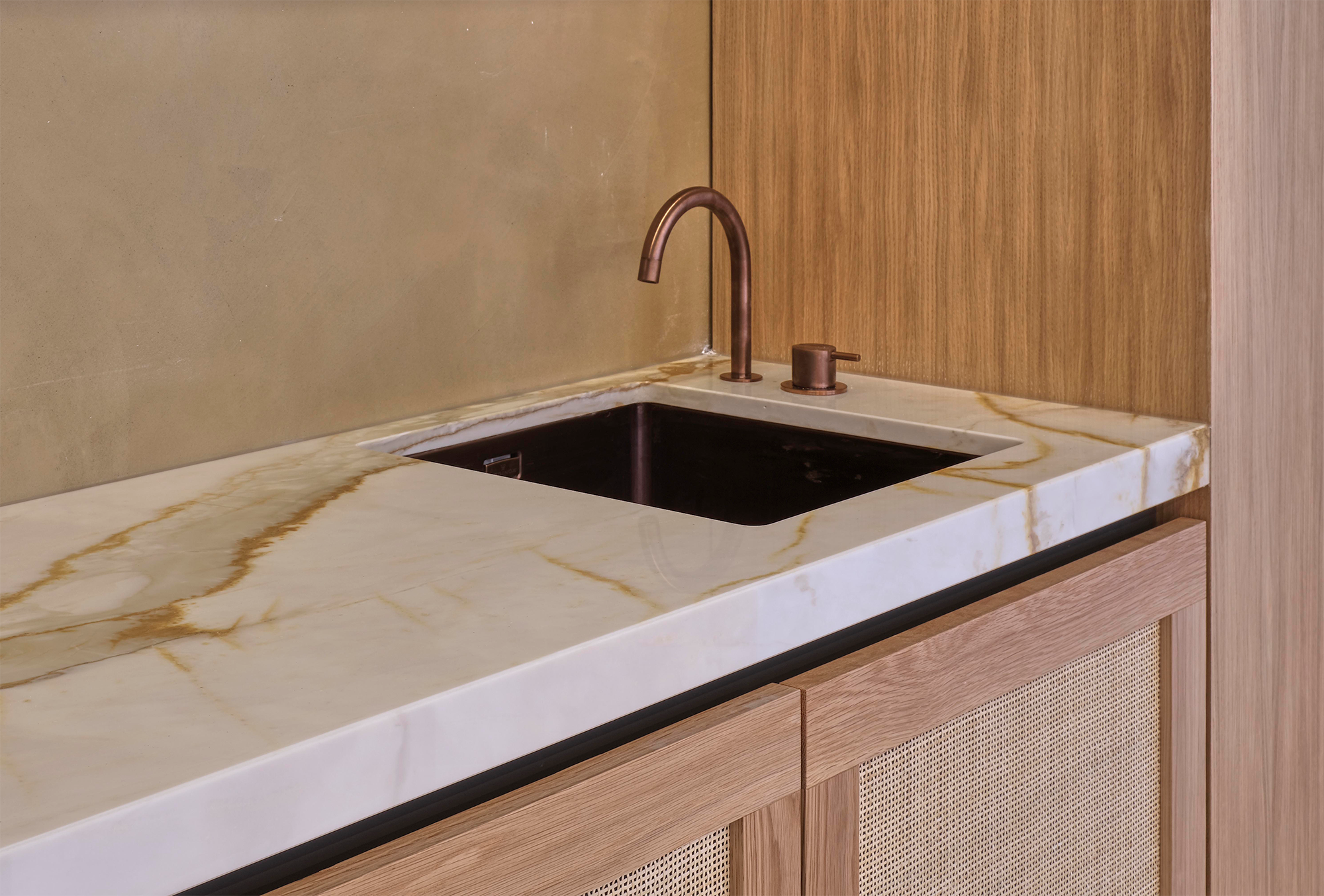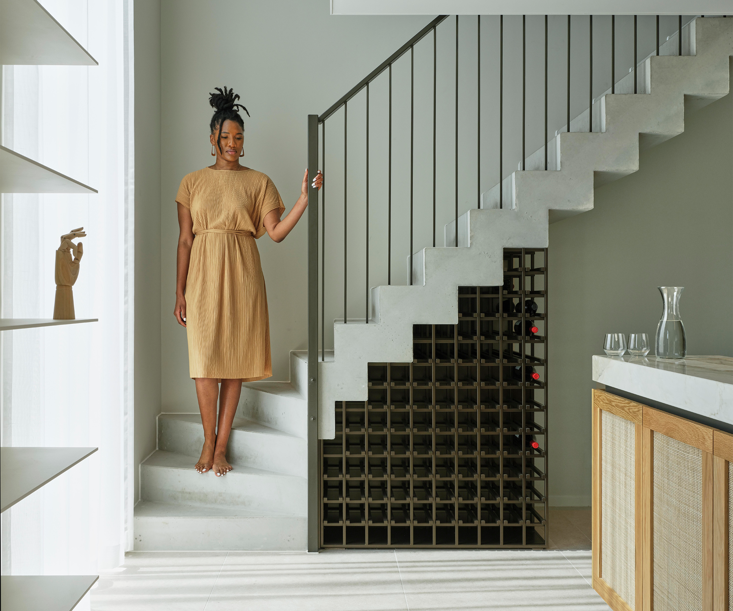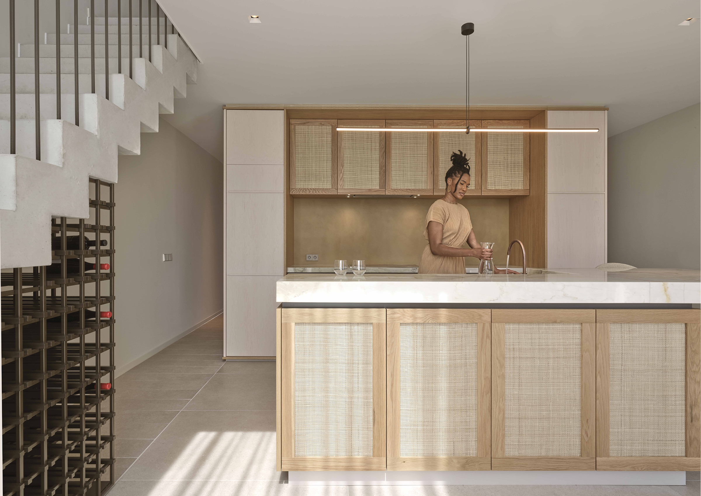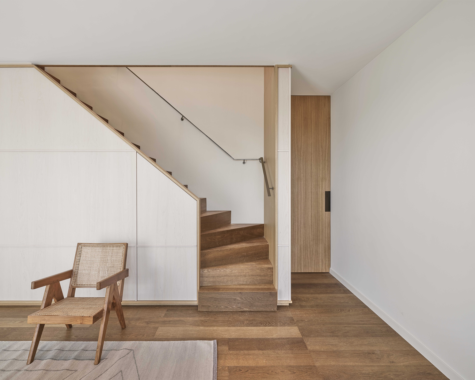 In contrast to the building’s raw concrete exterior, the interior design emphasizes warmth and tactility. A distinctive wooden core with fine, continuous detailing forms the heart of the home, guiding movement and creating a cohesive material narrative throughout the space.