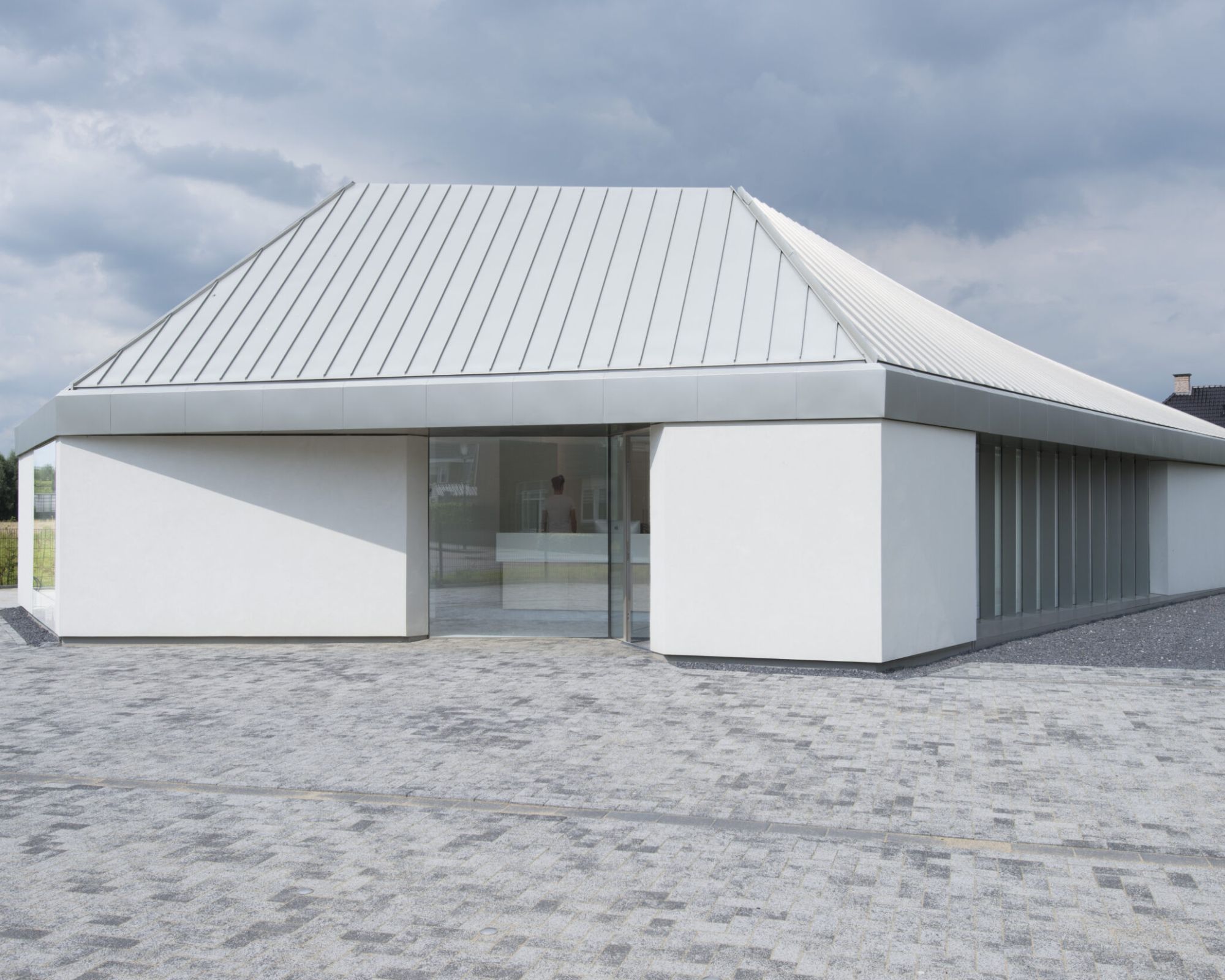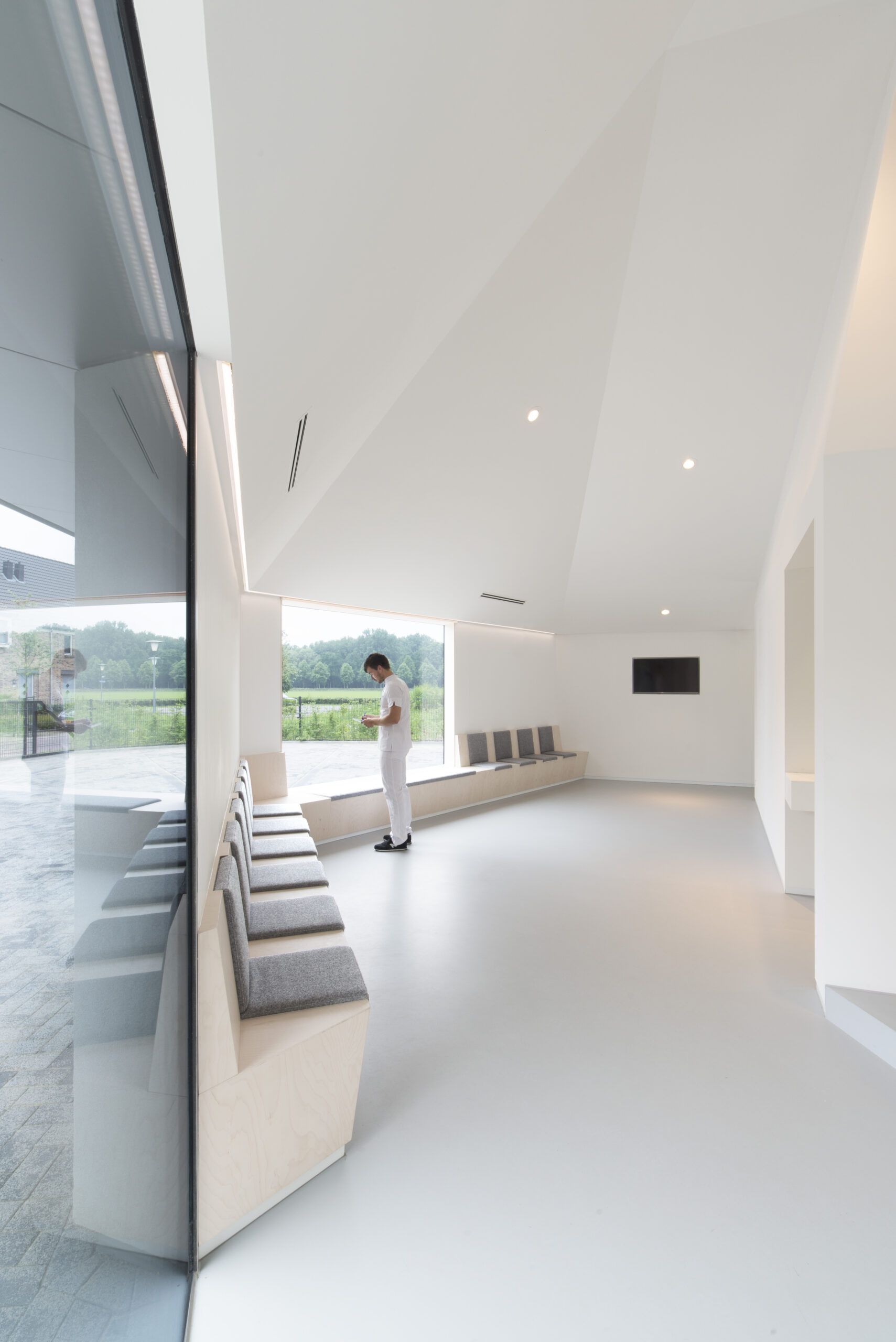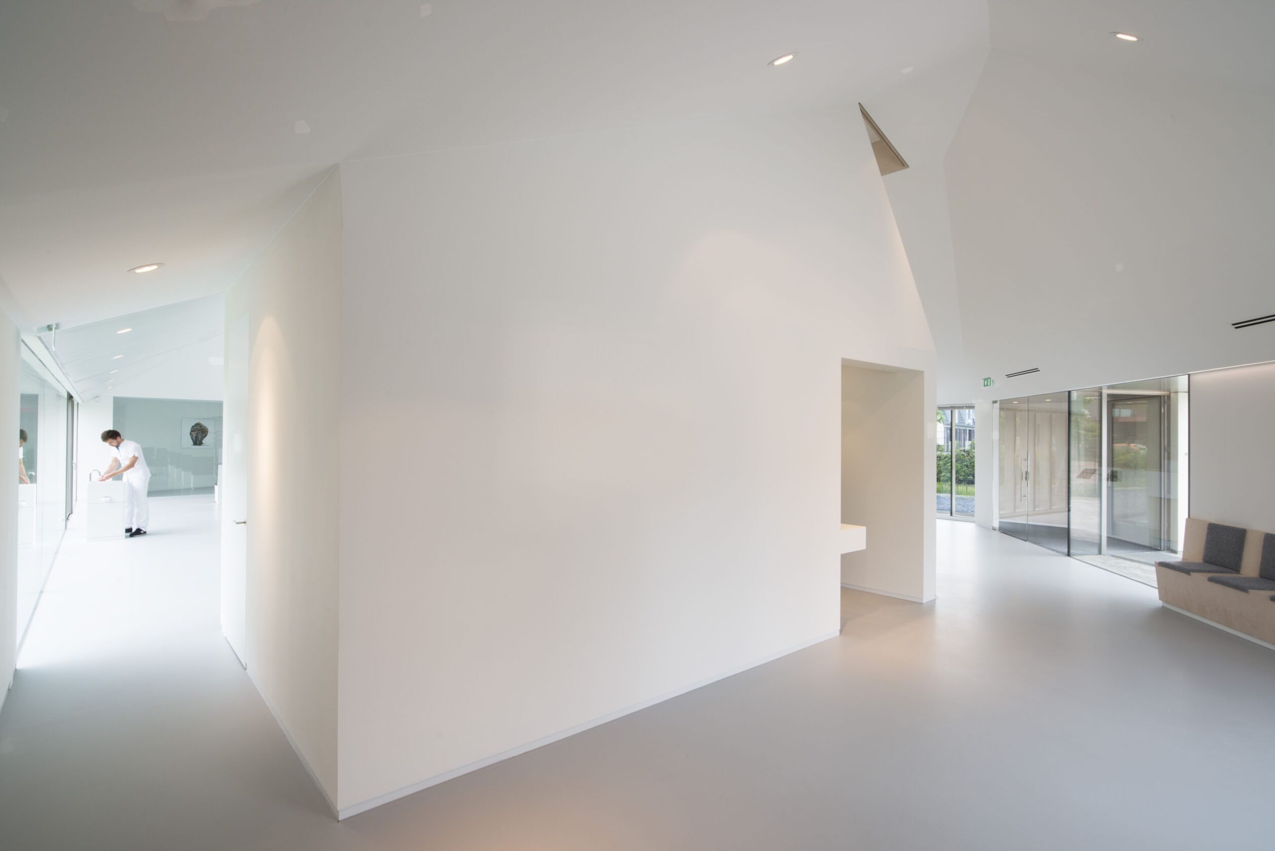 A carefully coordinated palette of colors and sustainable materials creates a serene atmosphere for patients. The light grey brickwork is combined with functional white tones of the fixed furniture. The skylight forms the backbone of the building, and the interplay of light through it ensures that daylight penetrates deep into the interior.