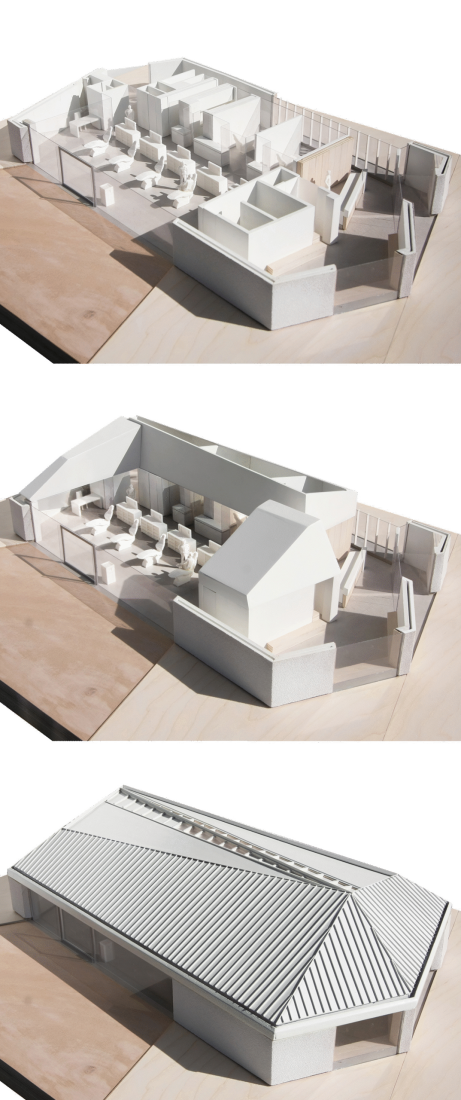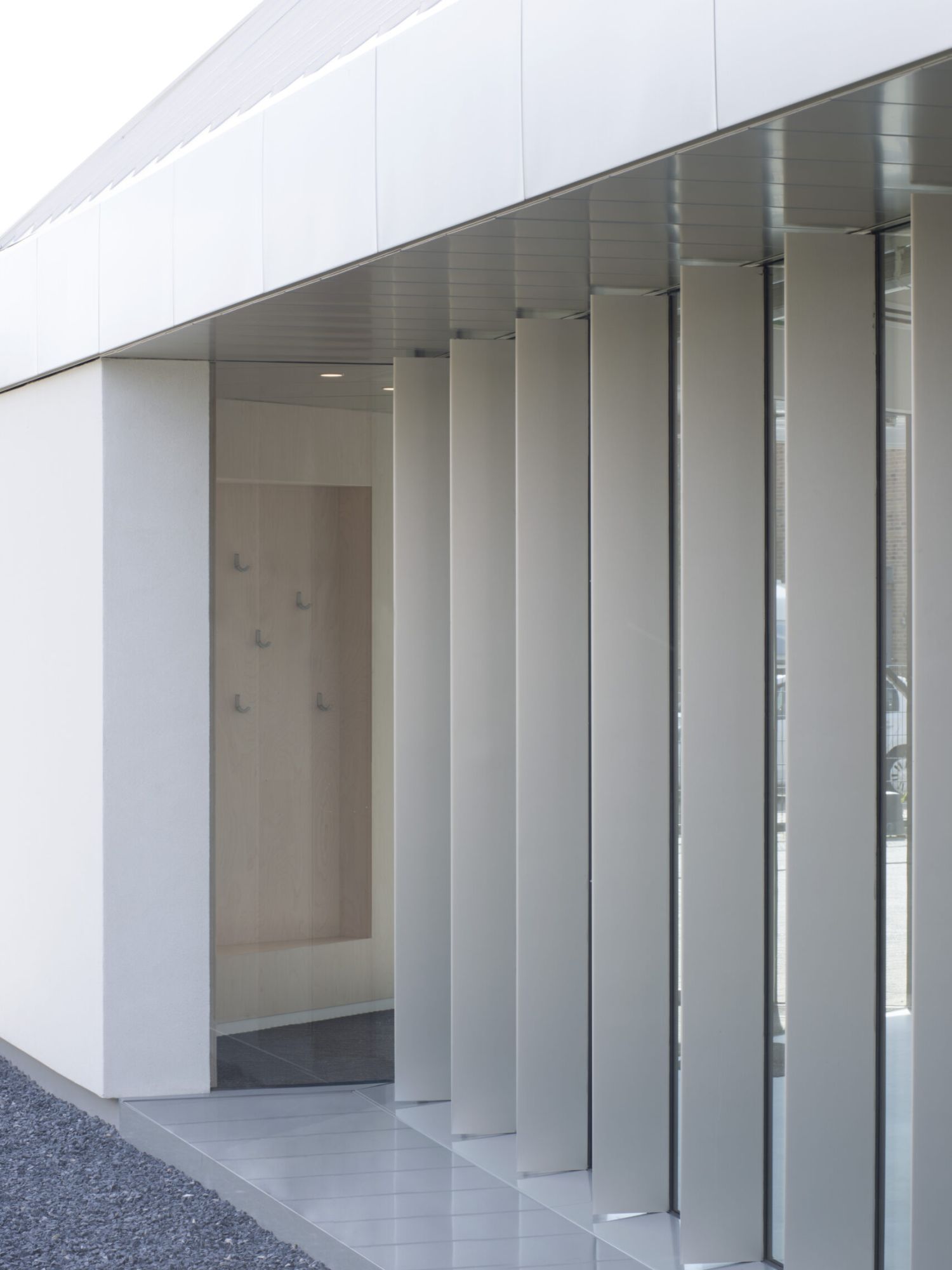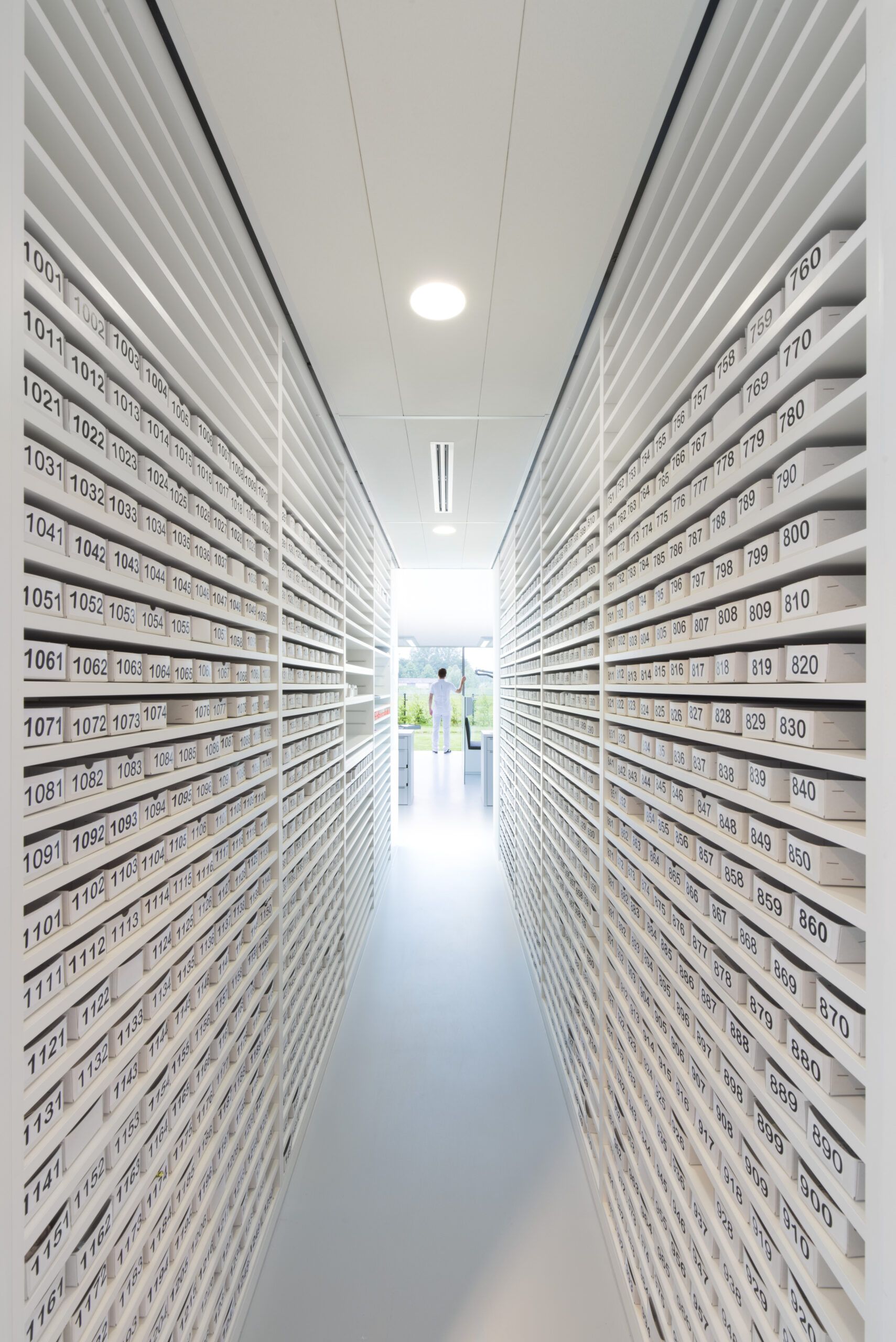 A carefully coordinated palette of colors and sustainable materials creates a serene atmosphere for patients. The light grey brickwork is combined with functional white tones of the fixed furniture. The skylight forms the backbone of the building, and the interplay of light through it ensures that daylight penetrates deep into the interior.