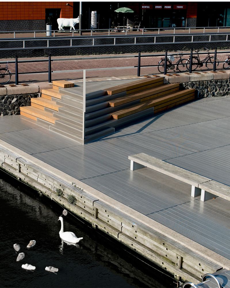 Zouthaven is poised to become a public gateway, connecting tourists from the cruise terminal to Amsterdam’s city center. The tribune stair responds to this role with a point-shaped form that naturally guides visitors along the route. Its design balances functionality with experience: two distinct resting areas face either the sun or the water, offering comfort and orientation.