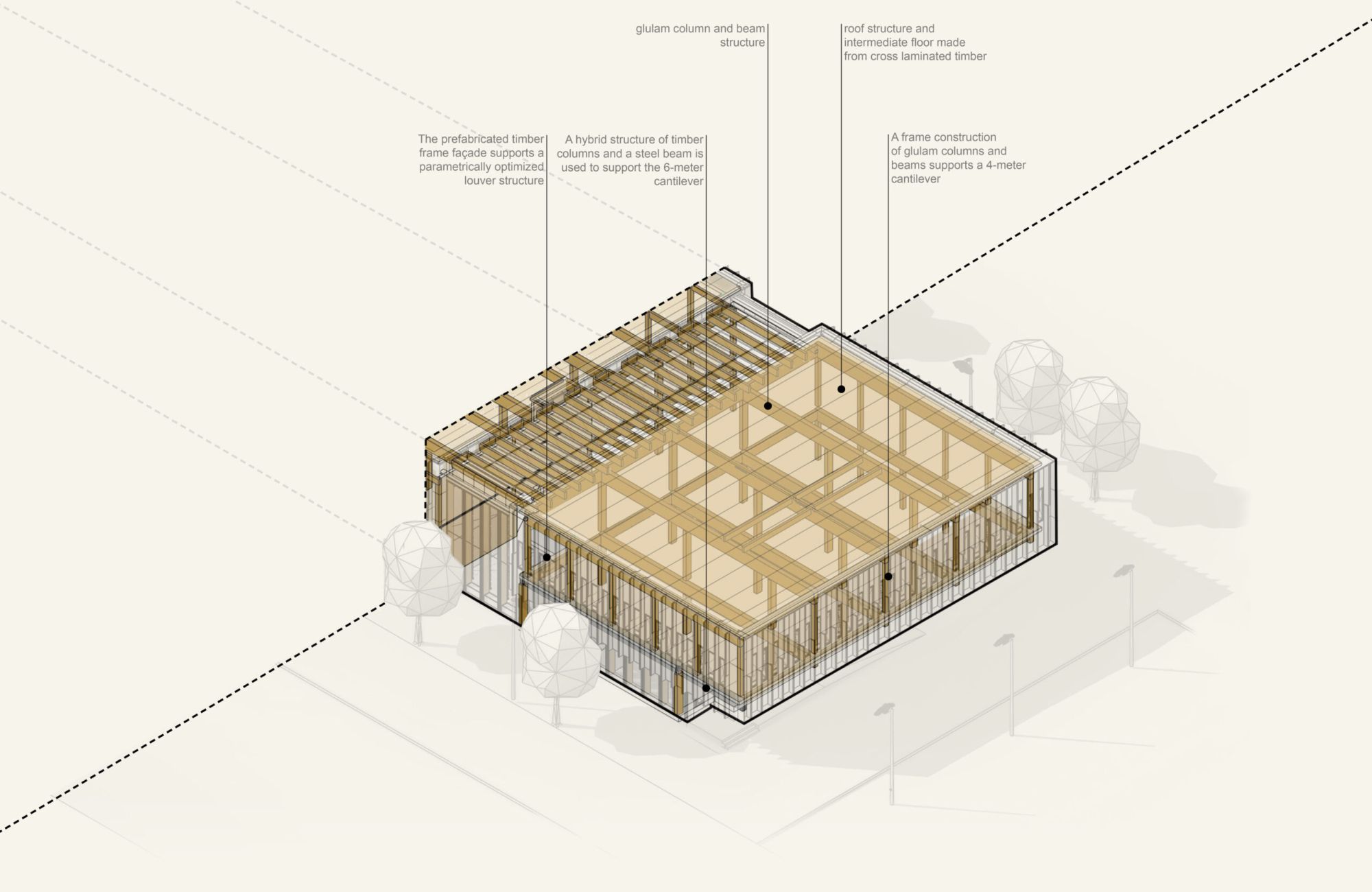 The office and training section is entirely biobased: walls, floors, and columns are constructed from CLT, timber frame (HSB), and laminated timber. The vehicle storage and warehouse areas are built with a demountable steel structure and concrete floors, designed for heavy vehicles and large spans. The building is fully demountable and flexible, allowing new clusters to be added and office functions to further develop within the structure of the storage area.