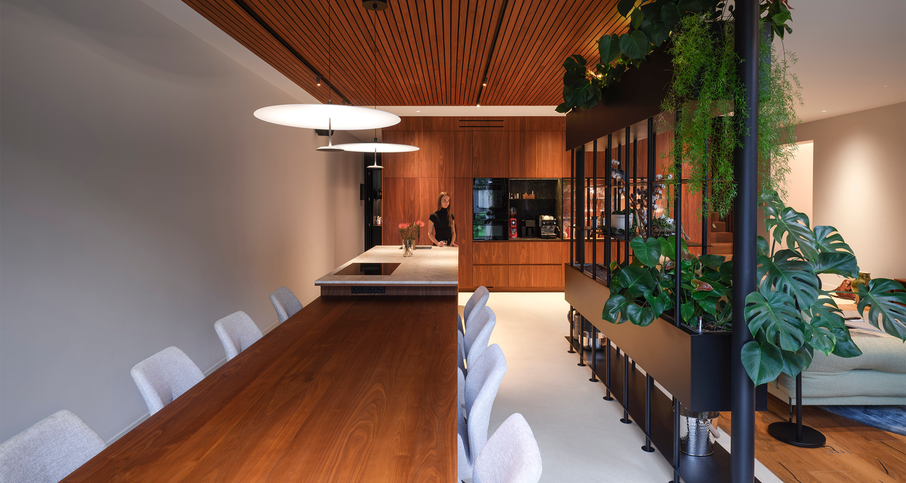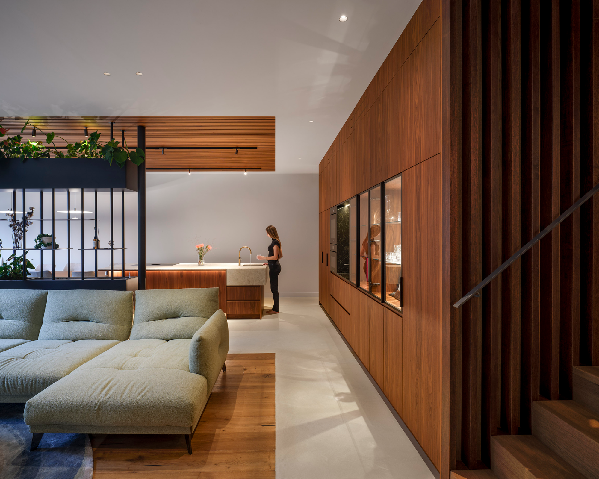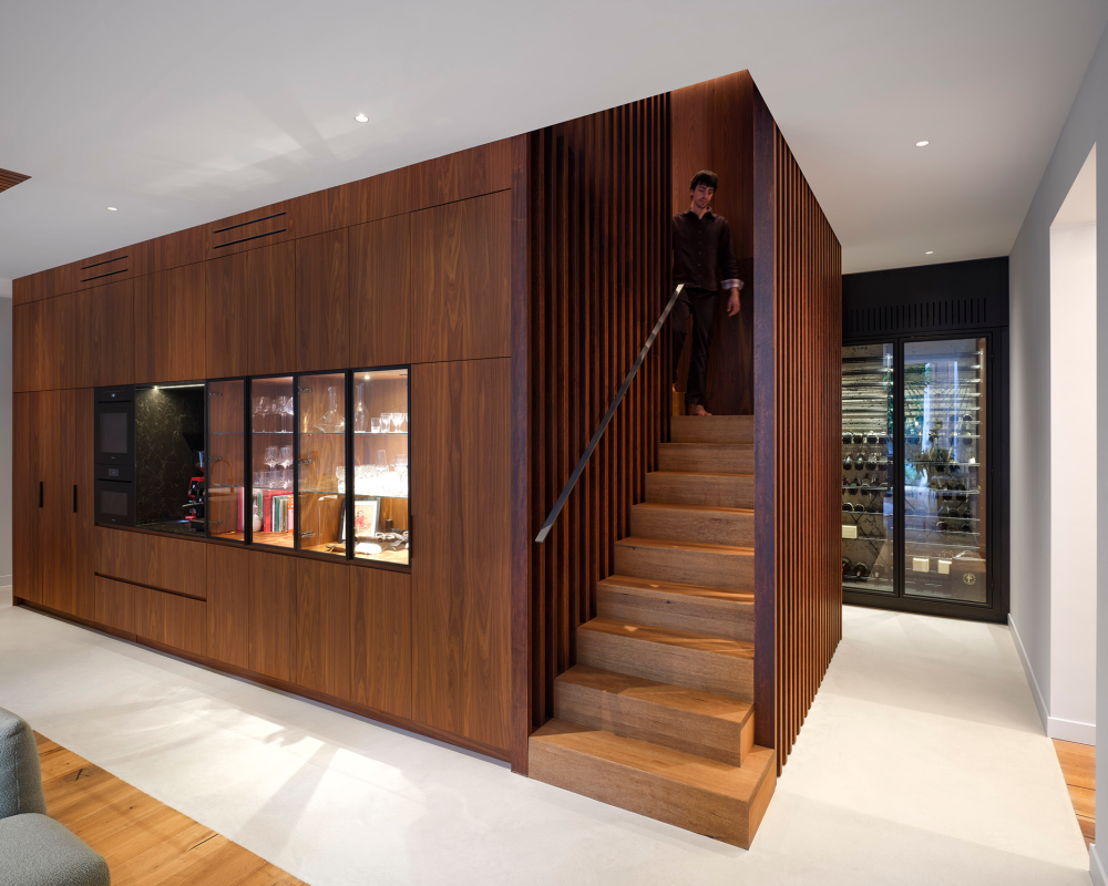 Material contrasts reinforce the spatial logic of the house. A walnut-clad core subtly contrasts with lighter oak finishes in floors and surrounding spaces, allowing light and shadow to articulate the interior. Openness alternates with moments of privacy, introduced through layered transitions and concealed access points. Visual connections between levels are strengthened by a full-grown tree rising through the central void, anchoring the interior and connecting the domestic spaces to the enclosed gardens.