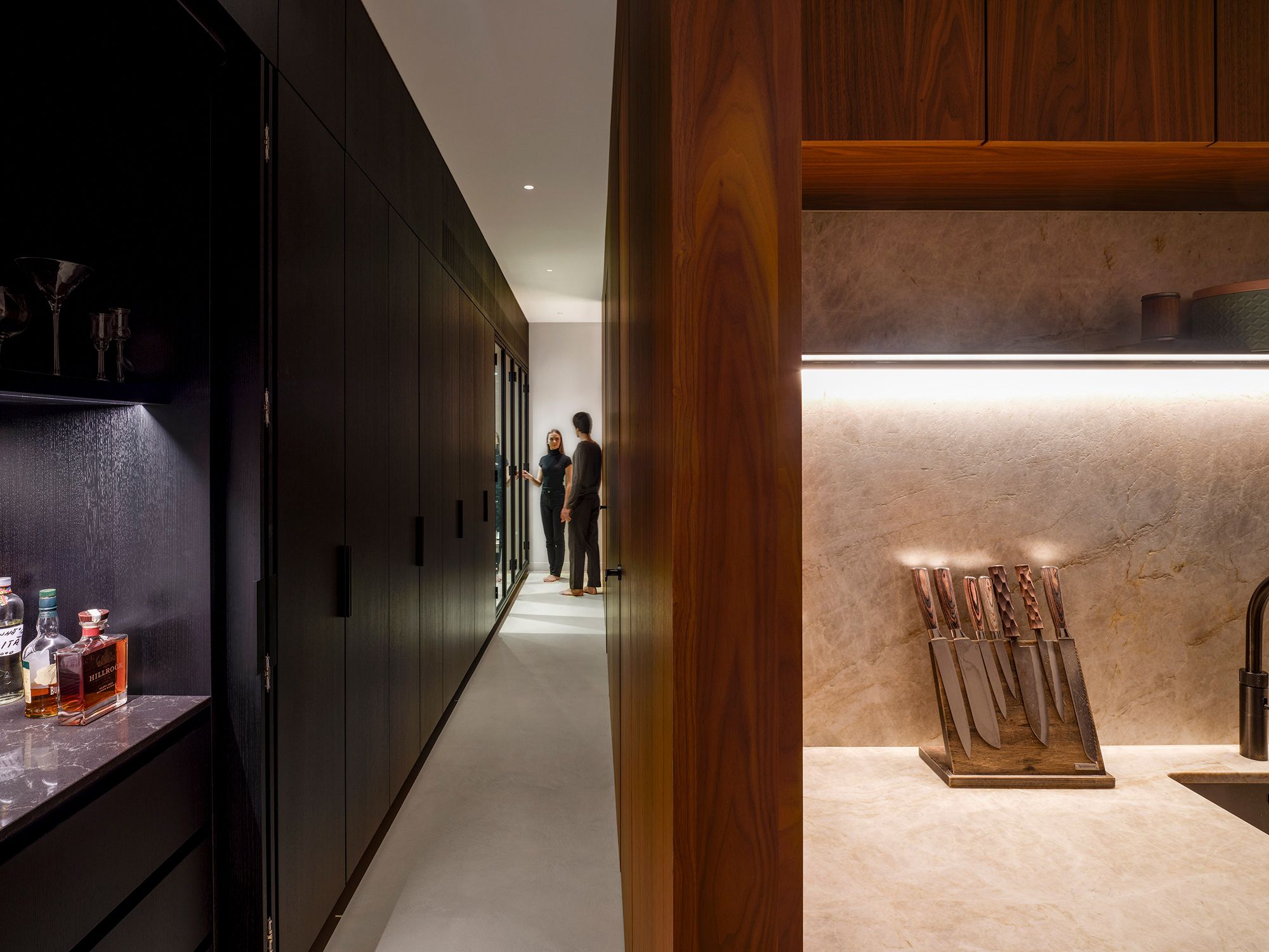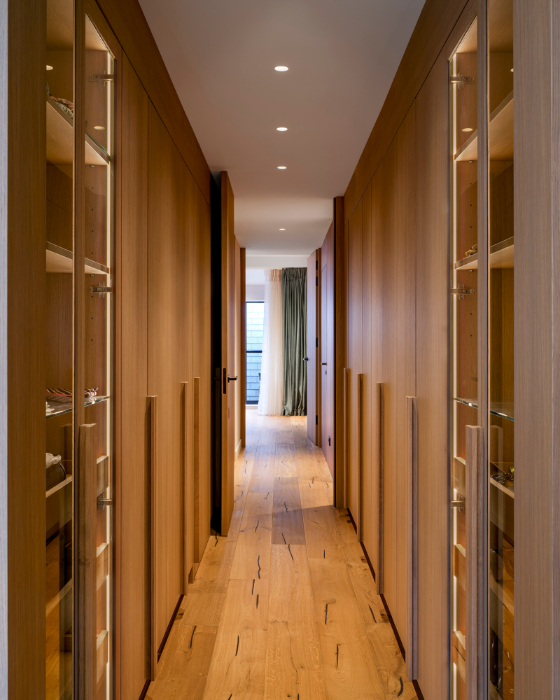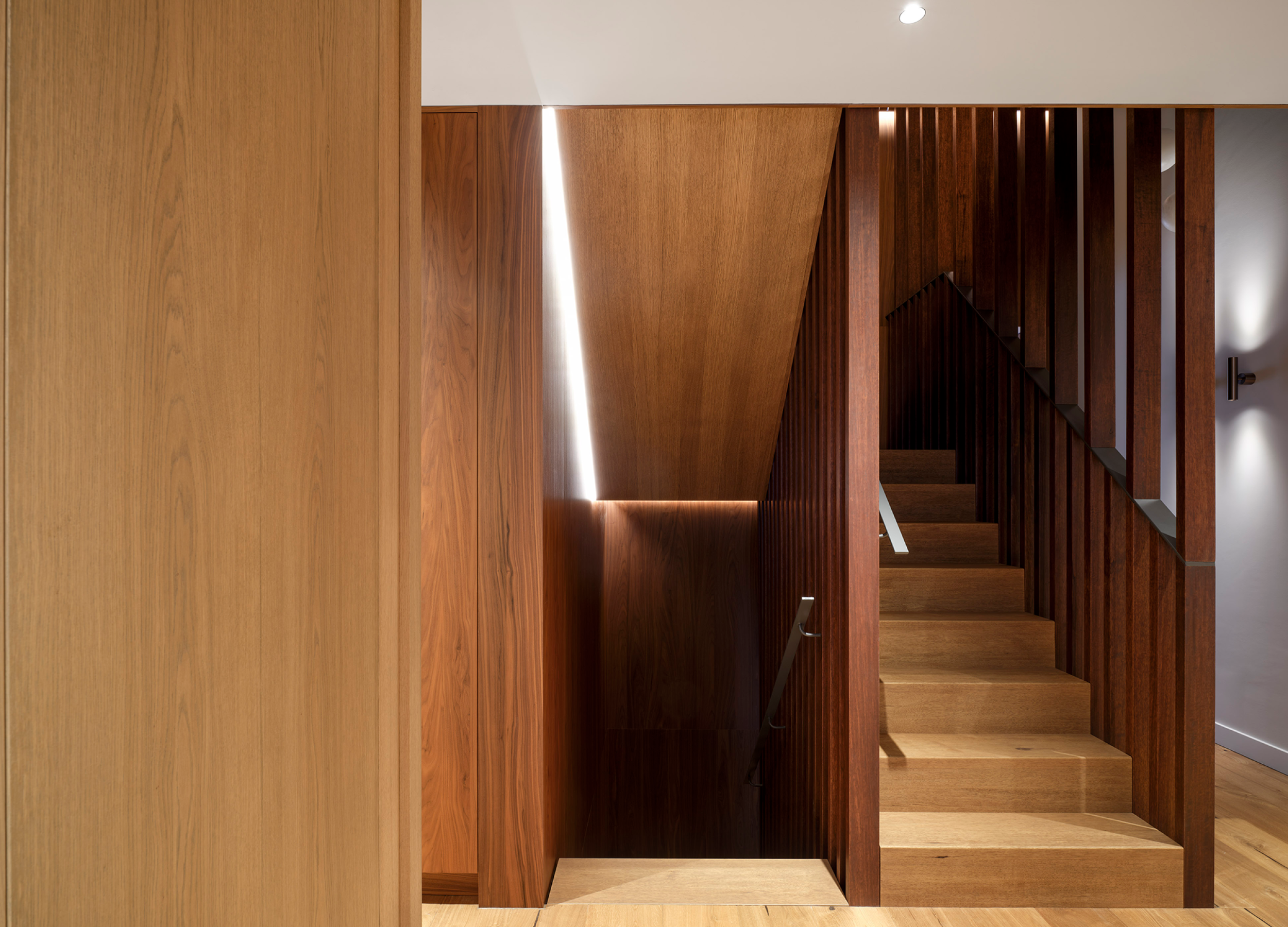 Material contrasts reinforce the spatial logic of the house. A walnut-clad core subtly contrasts with lighter oak finishes in floors and surrounding spaces, allowing light and shadow to articulate the interior. Openness alternates with moments of privacy, introduced through layered transitions and concealed access points. Visual connections between levels are strengthened by a full-grown tree rising through the central void, anchoring the interior and connecting the domestic spaces to the enclosed gardens.