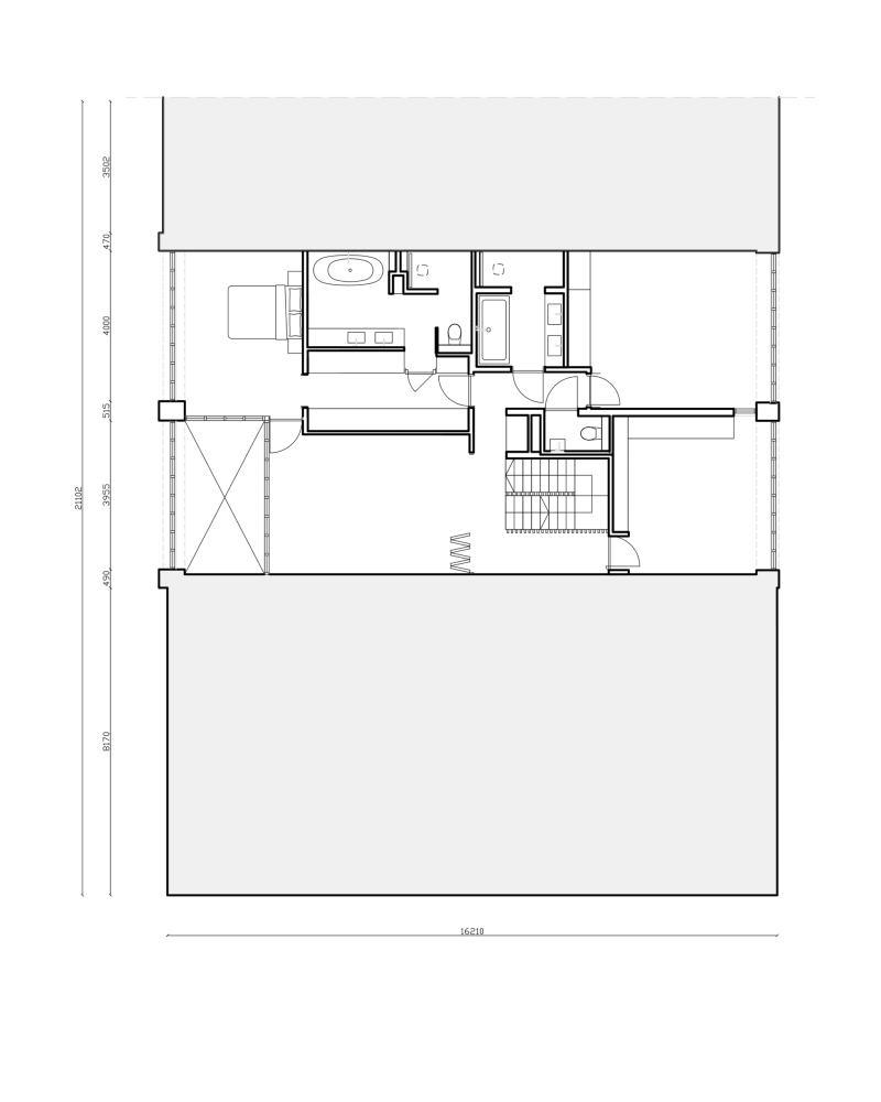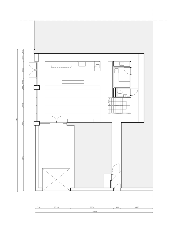 The interior is organised around a central wooden volume that connects and structures the three living levels. This core accommodates all supporting functions of the house, including storage, kitchen appliances, sanitary spaces, and technical installations. Concentrating what is closed allows the surrounding spaces to remain open and fluid, while continuous sightlines and circulation routes draw daylight deep into the plan. The wooden staircase unfolds within this volume as both a spatial sequence and an architectural object.