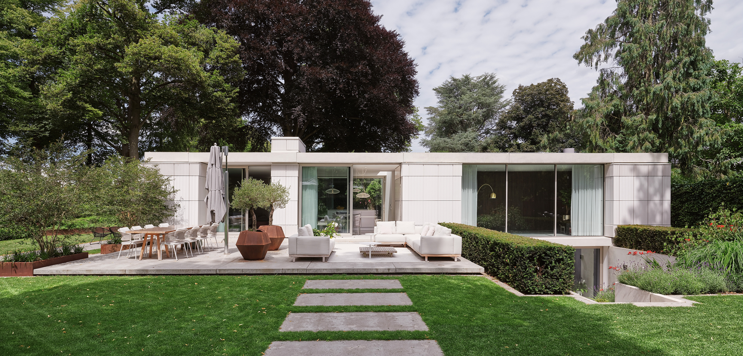 The plot situated on the Sint Annastraat is subdivided and was part of an estate that was owned by the Vroom family. Studio PROTOTYPE designed a one-level volume that is fully oriented towards the greenery and serves the surrounding landscape. The tension between the tall, monumental trees and the light horizontal volume results in a beautiful contrast and interplay between the two elements.