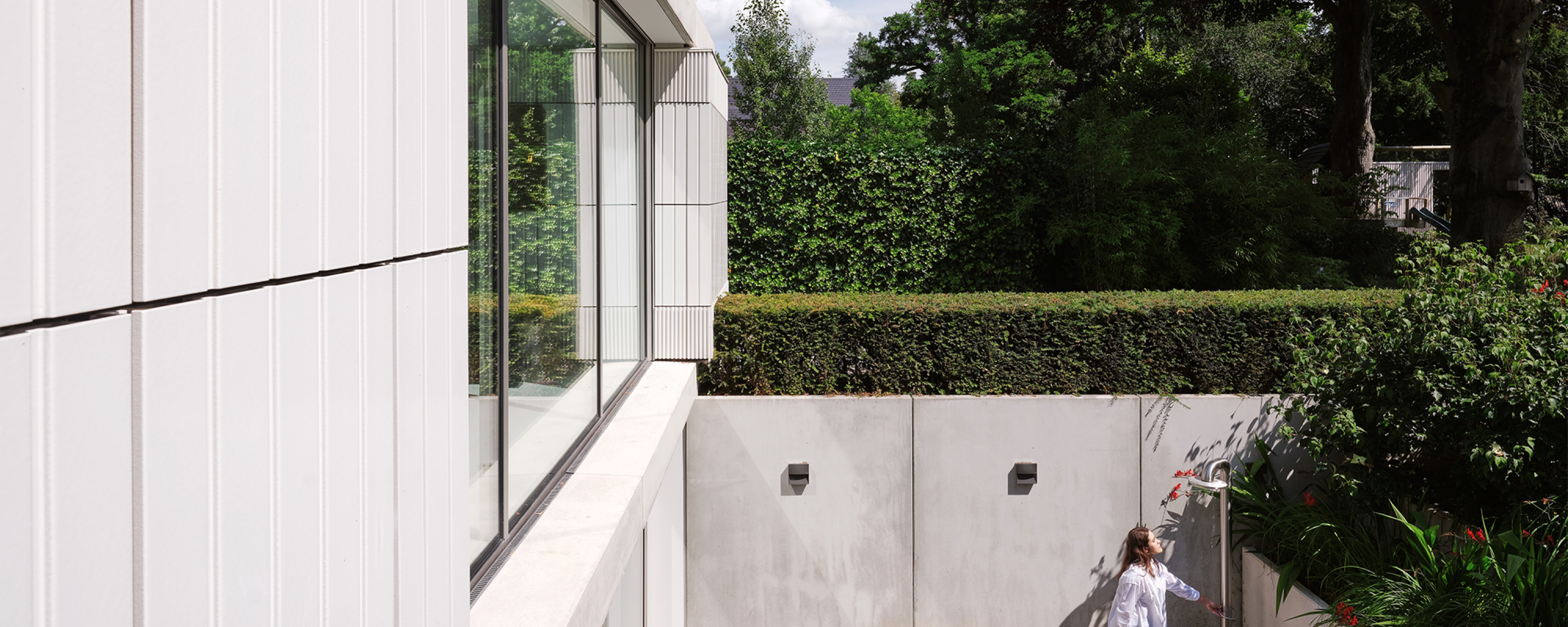 At the entrance, an impressive panorama window gives the visitor a beautiful view to the landscape.The house is constructed of specially designed ceramic profiled façade panels and are coated with a light glaze.